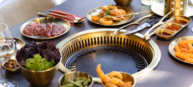 Wenn ihr nicht nur essen, sondern selbst grillen wollt, seid ihr hier richtig. Sajado Korean BBQ kombiniert großes Asia-Buffet mit Tischgrill. In der Mitte des Tisches ist ein integrierter Grill, auf dem ihr mariniertes Fleisch, Meeresfrüchte oder Gemüse selbst zubereitet.